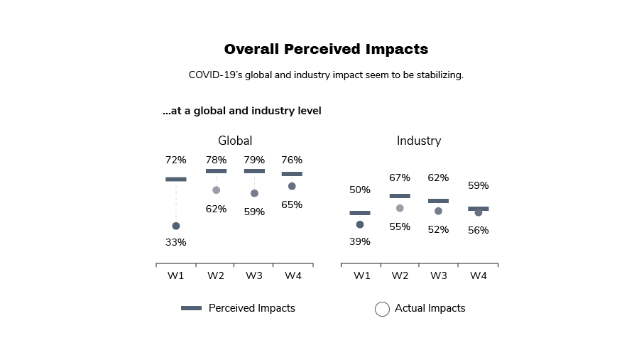 By wave four of the four-part survey, numbers seemed to be stabilizing, with concern about the actual impact of COVID-19 rising to the point where it converges with the perceived impact at the industry level.