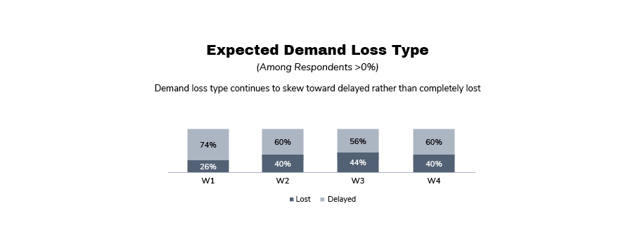 Regarding demand, the perception that it would be outright lost started out small, with just over a quarter of respondents fearing that demand was gone forever. But as the pandemic and the resulting shutdown persisted, the fear that demand was lost rose and then – in what might indicate a glimmer of hope – stabilized.