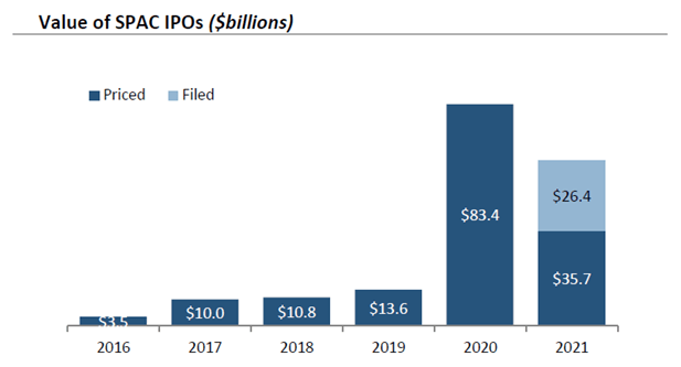 SPAC热潮吸引了很多人,这也在一定程度上导致了保证金的溢价。大约有330个SPAC在寻求大约1,350亿美元资本的业务合并。这让SPAC的IPO在年底很可能会超过传统IPO。