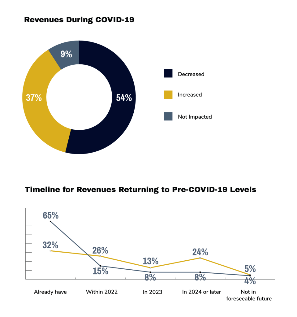 Most of the CFOs we surveyed (54%) said their company’s revenues decreased because of COVID-19. Of these, around one-third (32%) said revenues had already recovered. More than 4 in 10 did not expect to recover until 2023 or later, if at all. For those who saw a positive impact on revenue, this was largely short-lived, with 65% reporting their revenue had already returned to normal.