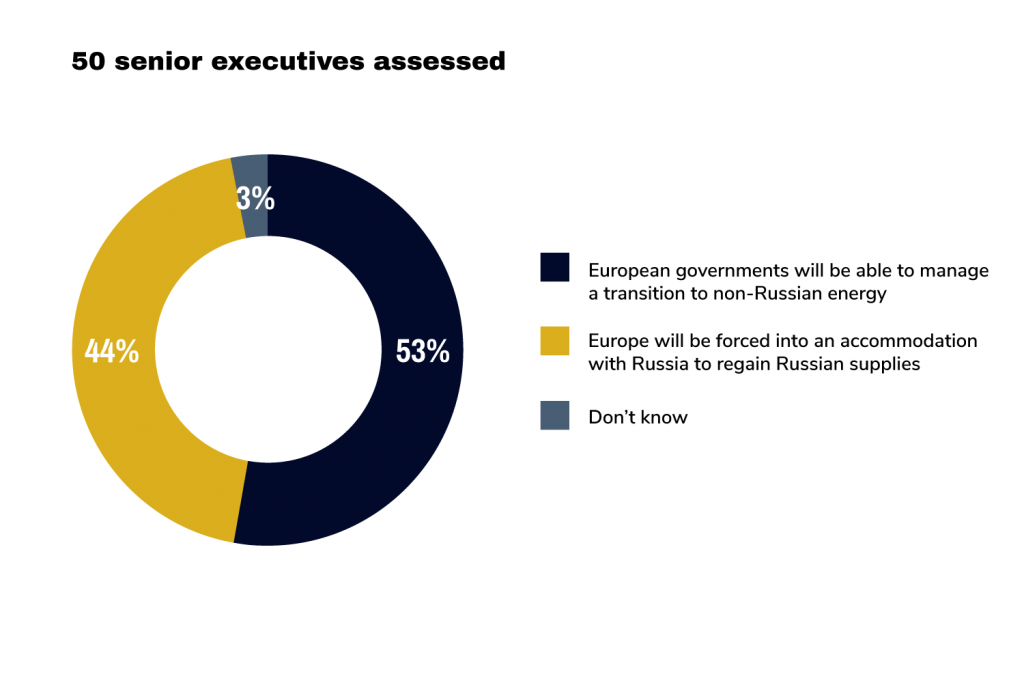 Less than half (44%) of our respondents forecast that Europe will be forced to strike some kind of deal with Russia to regain Russian energy, while 54% feel that Europe will manage a transition to non-Russian energy.