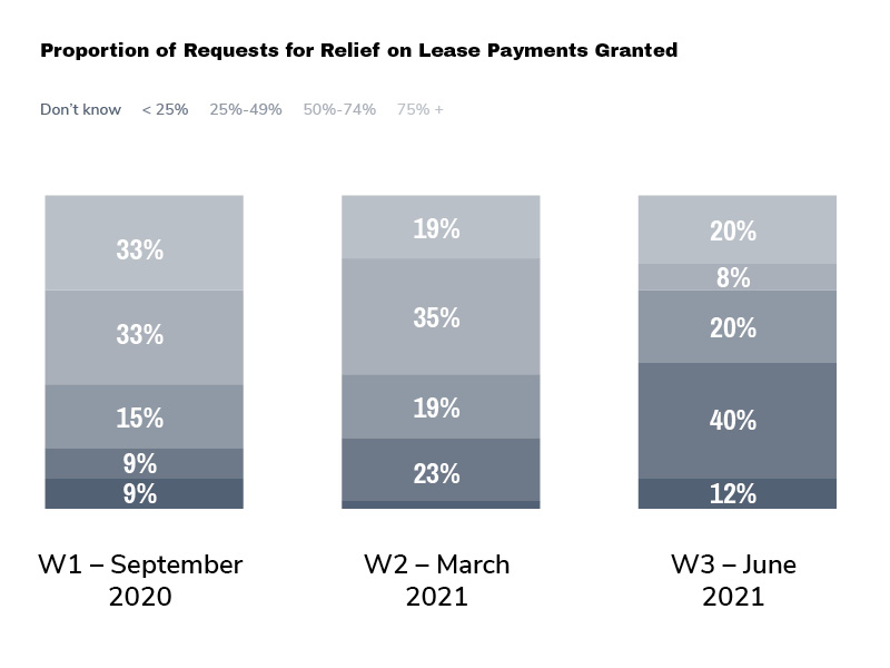 COVID’s impact on airlines rippled through the industry, impacting the aircraft lessors that GLG surveyed. In September 2020, 66% of the lessor respondents said that their companies had granted relief requests. This diminishes to 54% in March 2021 and 28% in June 2021. This still points to a slow recovery for aircraft lessors, which have faced significant income reductions.
