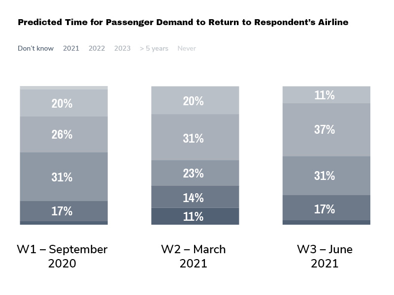In September 2020 and March 2021, 20% of our respondents predicted a 2021 recovery. But as COVID persisted, even that optimism waned. In June, just 11% foresaw a complete recovery in 2021. The most widely held view (31% in June) is that a full recovery is not likely until 2023.