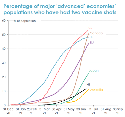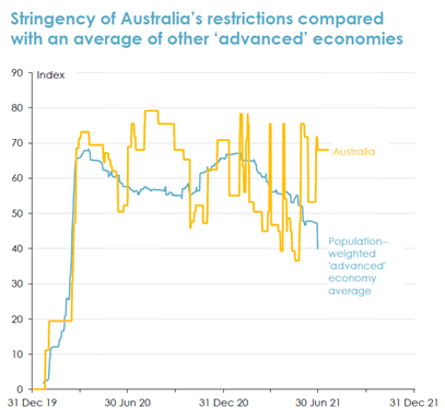 The restrictions that Australians are now experiencing are stricter than those across advanced economies. The likelihood is that Australia will have this on and off until it gets an excess of 80% of its population vaccinated, which probably will not be before the end of the year.