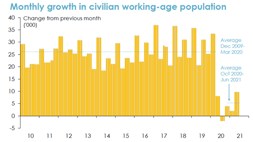 But since the closure of its borders in March last year, the civilian working-age population has grown at an average rate of about 6,000 a month with the inclusion of the June quarter, when more people left Australia than arrived in it. The significance of this much slower growth in the working-age population is that far fewer jobs need to be created per month to get the unemployment rate to fall.